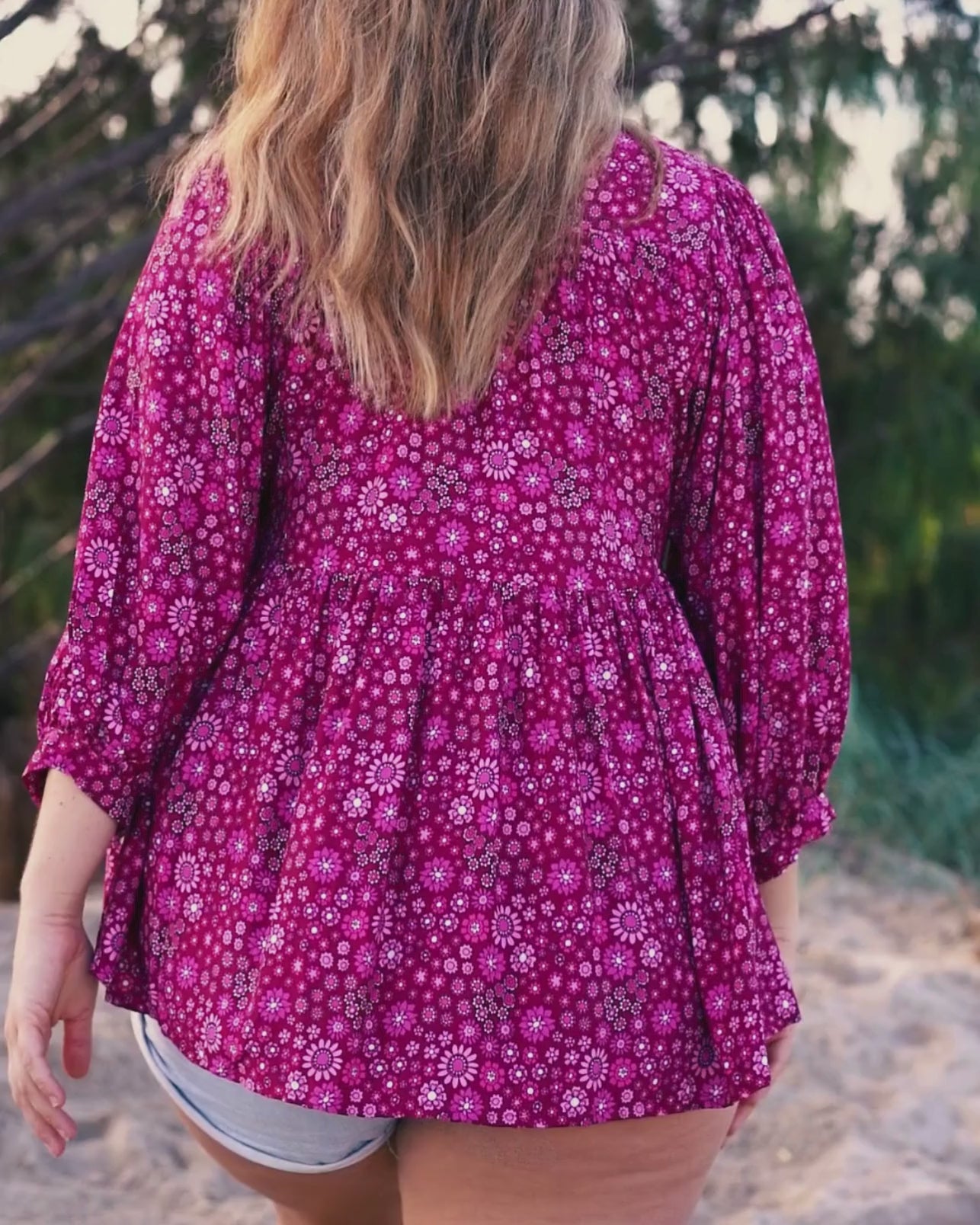 This effortlessly stylish top features our vibrant Boysenberry print, perfectly paired with denim. It's your ultimate pick for cozy comfort and a fun boho vibe!