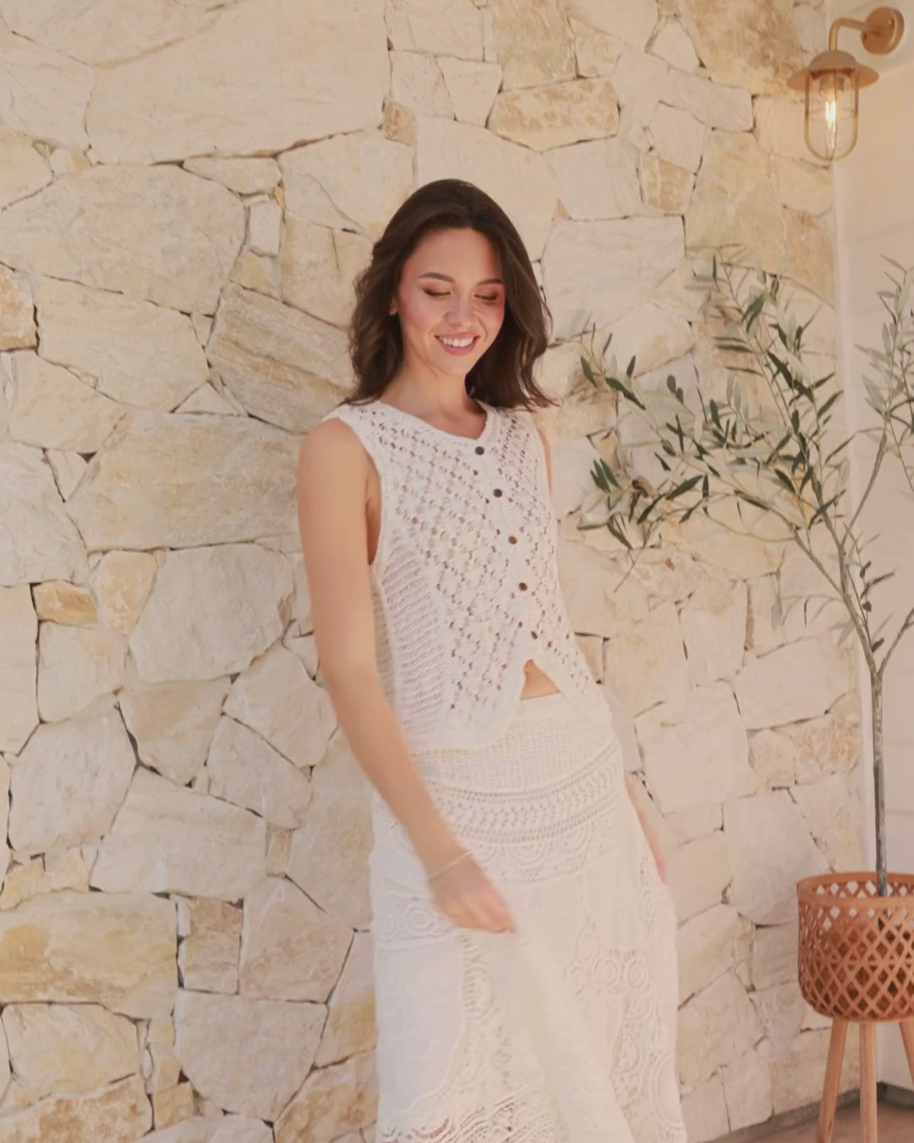 This Mahli Vest in white features delicate cotton lace crochet and charming coconut buttons. Wear it as a stylish vest or layer it over your favourite tops for a versatile, lightweight addition to your wardrobe. Perfect for adding a touch of vintage-inspired elegance to any outfit.