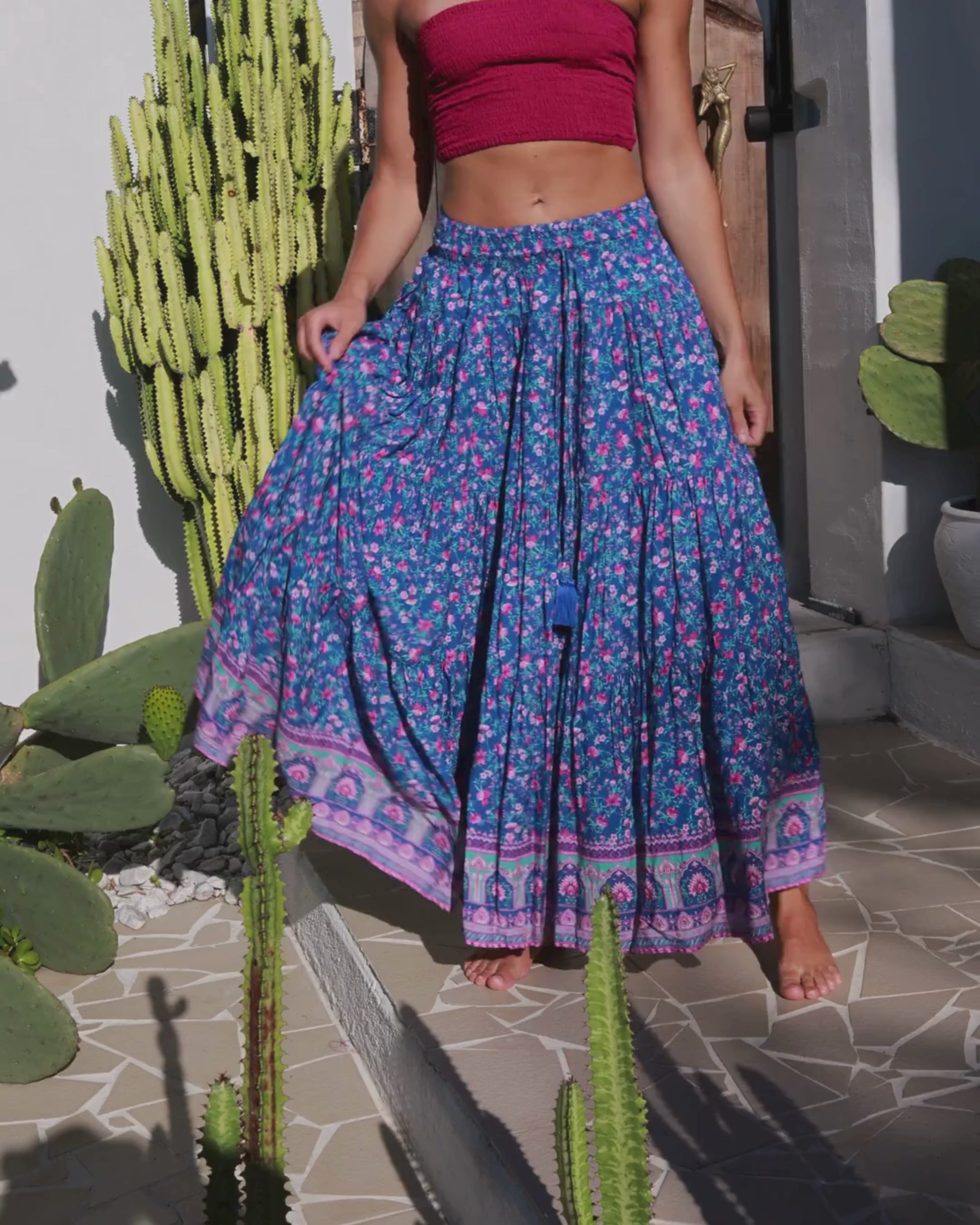 Introducing Oakley, our maxi skirt featuring the charming Aura border print. This beauty is a timeless boho fave, radiating feminine vibes! With four gathered tiers full of flow and volume, she dances gracefully with every step you take.